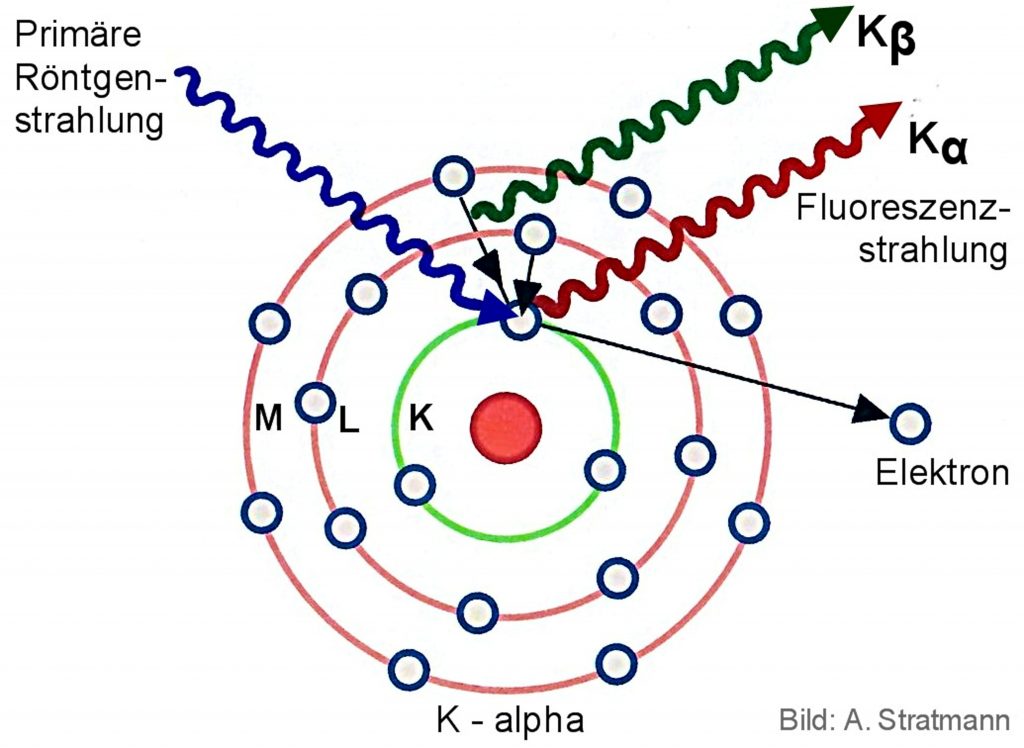 Jedem chemischen Element entspricht eine Atomsorte. Der Atomkern wird auf unterschiedlichen Schalen von Elektronen umkreist. In dem Röntgenanalysegerät wird nun eine primäre Röntgenstrahlung erzeugt, die die Atome des Probenmaterials anregt und quasi ein Elektron aus der inneren K-Schale herausschlägt. Die so entstandene Lücke wird durch ein Elektron der nächsten Schale aufgefüllt.